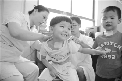 7月12日,于向民、于荣民双胞胎兄妹来到青岛黄岛中医医院免费贴“三伏贴”。视觉中国