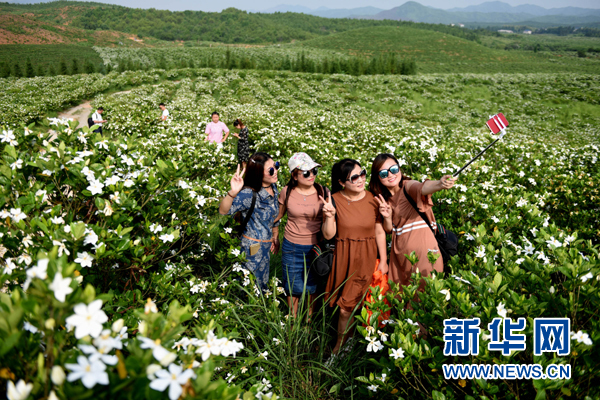 游客及市民在乐平市建军中药材种植专业合作社的千亩黄栀子基地赏栀子花(5月25日摄)。新华社记者 宋振平 摄