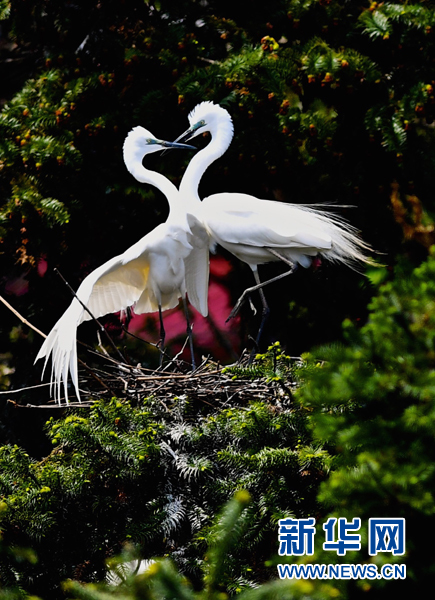 在鄱阳湖畔的南昌象山森林公园,两只白鹭在嬉戏(4月14日摄)。新华社记者 胡晨欢 摄
