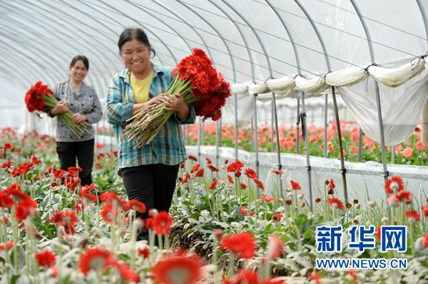 在江西省靖安县水口乡桃源村,当地农户在非洲菊种植基地采摘花卉准备外销(4月20日摄)。新华社记者 彭昭之 摄