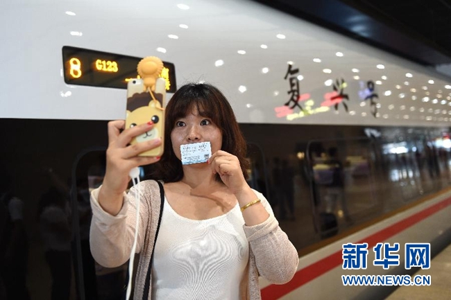 6月26日,在北京南站,一位乘坐“复兴号”G123次列车的乘客在车外与列车合影。近年来,中国高铁继续保持快速发展步伐,“四纵四横”高铁网基本成形,技术成就赢得国际声誉,服务品质不断攀升。中国高铁已经成为一张见证时代发展的名片。新华社记者鞠焕宗摄