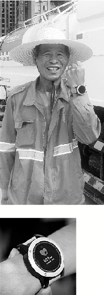 上图:环卫工人展示智能手环。下图:智能手环能测心率、能定位、能报警。