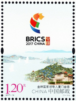 中国邮政定于8月19日发行《金砖国家领导人厦门会晤》纪念邮票1套1枚,邮票面值为1.20元。该套邮票以2017金砖国家领导人厦门会晤标识为主要设计元素,结合了鼓浪屿、厦门大学、集美学村等最具厦门特点的风光和人文标志,整幅画面视野开阔,色调雅致。
