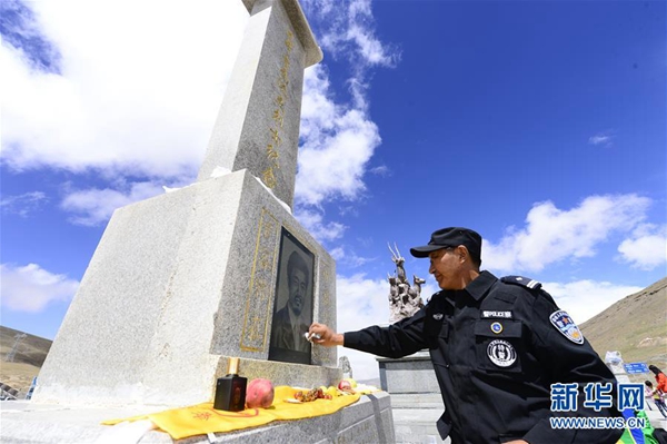 可可西里2017年第四批巡山队队长文嘎在昆仑山山口擦拭索南达杰烈士纪念碑(8月18日摄)。 新华社记者 张宏祥 摄