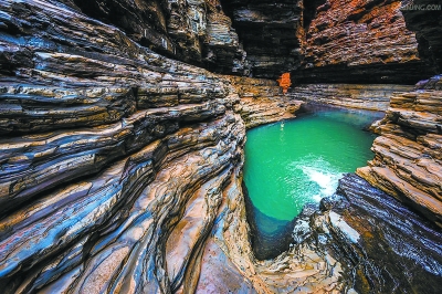 顺泥土路西行约一公里,道路左侧一塘碧波突然闯入眼帘。温润如玉,天光云影,细波粼粼,四周的白色崖壁险峻清奇。“这儿是挖汉白玉后遗留的矿坑,深70米。这水是从矿坑里涌出的山泉,水温14℃,冬暖夏凉,现已深50米,再过两天就能涌满池塘。”大石窝镇镇长朱华俊介绍,晴天泉水能见度极高,“乘船下水,可看见坑底采挖汉白玉留下的钢钎印。”