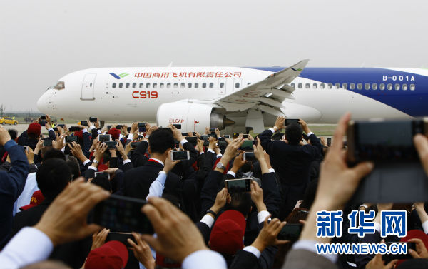 中国首款国际主流水准的干线客机C919在上海浦东国际机场首飞成功(5月5日摄)。新华社记者 方喆 摄