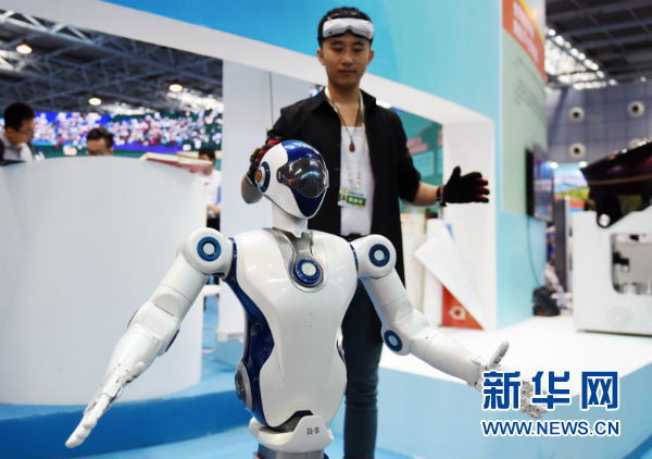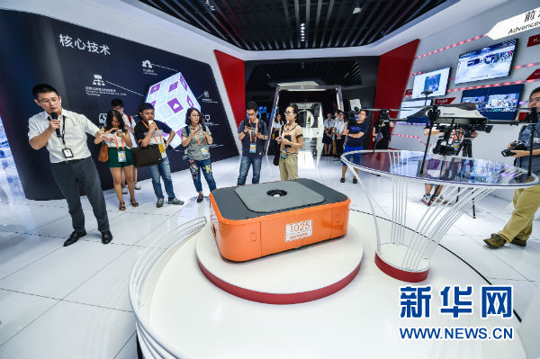 杭州海康威视数字技术股份有限公司工作人员在杭州向记者介绍公司新研发的物流机器人(2016年9月2日摄)。新华社记者 徐昱 摄