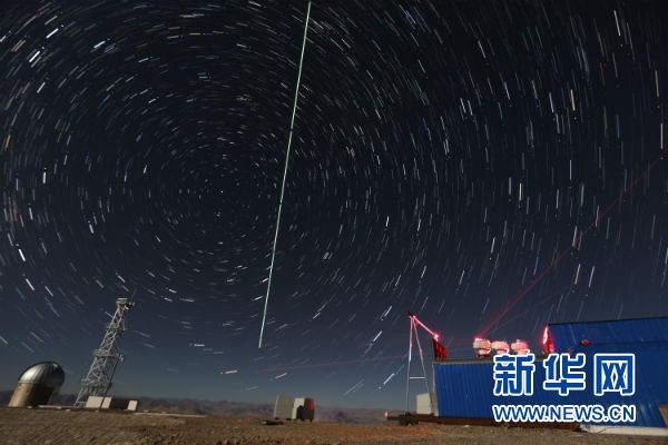 在西藏阿里观测站,“墨子号”量子科学实验卫星过境,科研人员在做实验(合成照片,2016年12月10日摄)。新华社记者 金立旺 摄