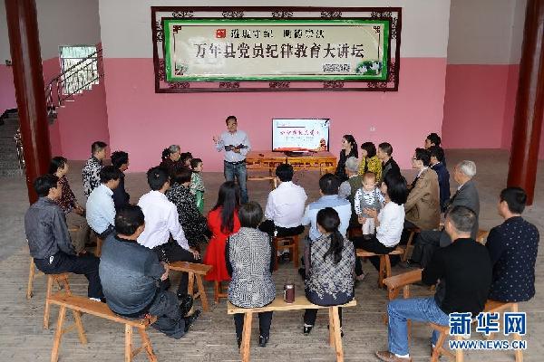 江西省上饶市万年县陈营镇马塘社区纪检监察干事黄中华在为党员和群众做题为“把纪律挺在前面”的专题宣讲(2015年10月28日摄)。新华社记者 万象 摄