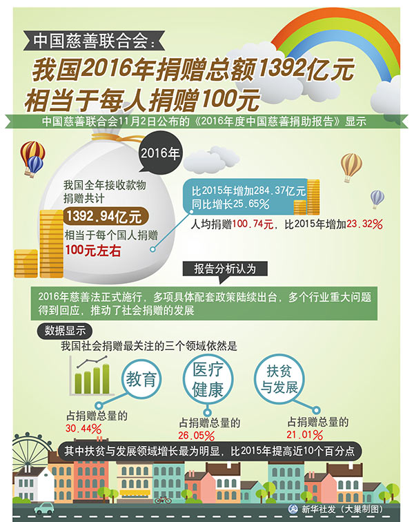 图表:中国慈善联合会:我国2016年捐赠总额1392亿元 相当于每人捐赠100元 新华社发大巢制图
