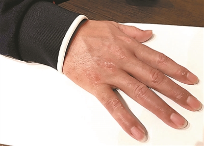 两年多来,周建刚一直在治病,手背等部位仍有癣块未消除