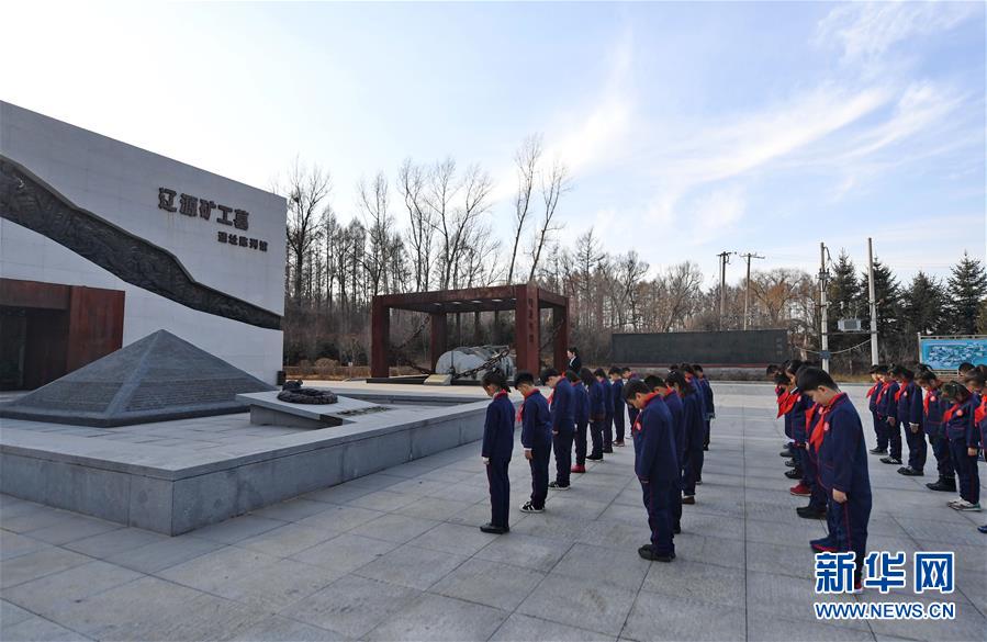 在辽源矿工墓陈列馆前,辽源市多寿路小学学生为死难同胞默哀(11月13日摄)。新华社记者 张楠 摄