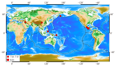 图为2017年全球MS(震级)≥7.0地震震中分布图