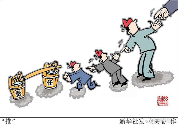 新华网北京12月27日电 一些部门向下层层签订“责任状”,出了问题就以此作为推脱责任的借口。当“履责”成了“推责”,必然导致“层层不负责”。担当责任,要以上率下、从我做起。对那些只会把责任甩给下级的官油子,必须从严惩治,坚决遏制只想当官不想干事的恶劣作风。(据新华社“新华视点”微博报道)