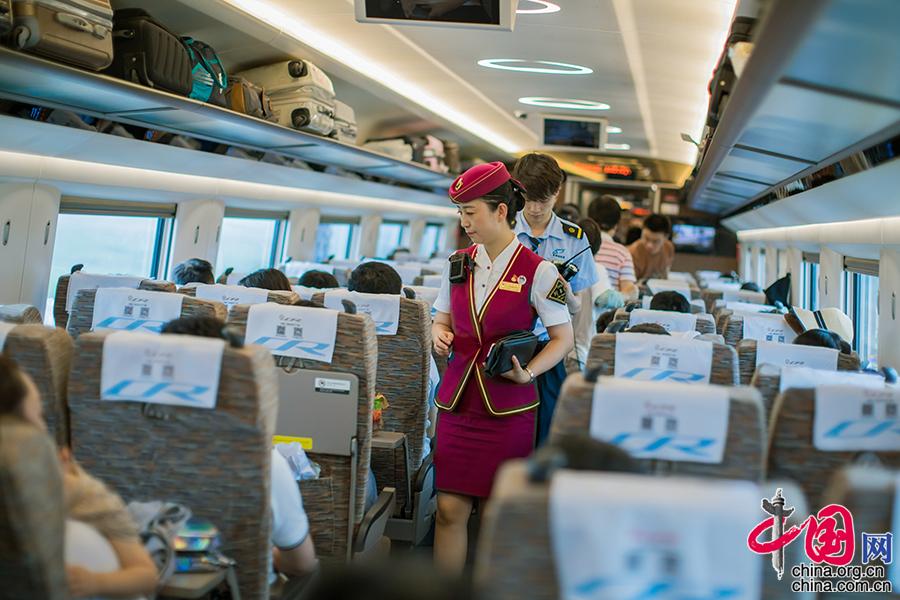 保证车辆正常运行是为乘客提供优质服务的前提,列车驶出车站,赵小琴和随车机械师、乘警一同对全车进行检查。随着改革开放这些年铁路的发展,现在的列车越来越有“科技范”,任何一个车上的细节都必须进行认真的检查才能保障旅客安全舒适的出行。中国网 郑亮摄