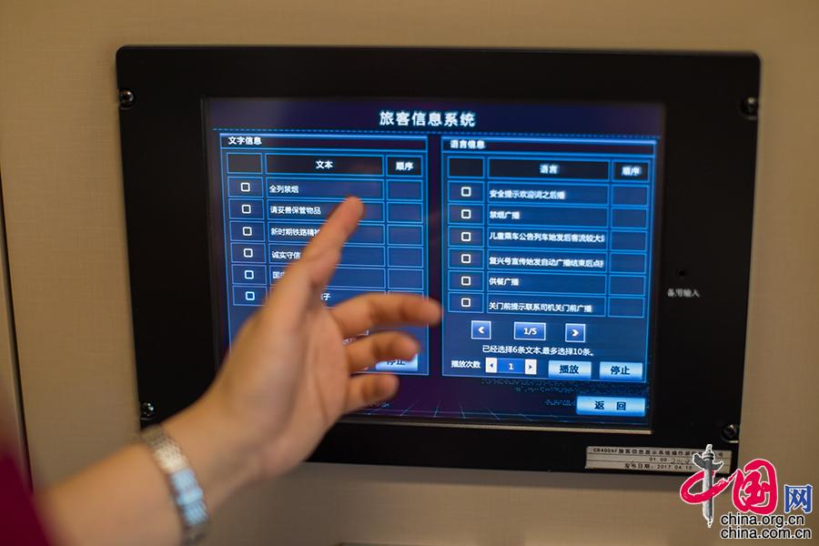 指着复兴号上的旅客信息系统,赵小琴说:“以前车上的广播都是用喇叭进行真人播报,而现在则是通过智能系统完成,点击旅客信息系统,选择需要广播的内容和顺序即可进行服务提示,非常的方便。也是这些年咱们列车智能化、科技化发展的一个体现。”中国网 郑亮摄