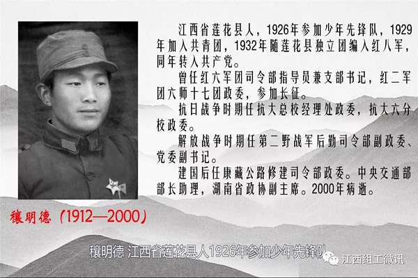 穰明德,江西省莲花县人。1926年参加少年先锋队,1929年加入共青团,1932年随莲花县独立团编入红八军,同年转入中国共产党。建国后任康藏公路修建司令部政委,中央交通部部长助理,湖南省政协副主席。