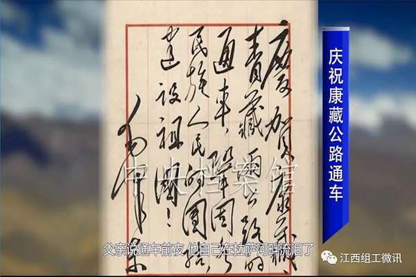 康藏公路1954年12月25号通车了。父亲说通车前夜,他自己在拉萨河畔流泪了。我曾经问过他为什么流泪,他没说。但是我现在也理解他,他是追忆康藏公路两千多公里,埋葬了两千多具忠骨,他想了他这些战友,过雪山草地没有冻死、饿死,被日本的子弹没有打死,被国民党的子弹没有打中,但是为了解救西藏人民,因为缺氧、因为超负荷的劳动倒在了川藏线上。而且我觉得父亲也没有辜负党中央毛主席的信任,完成了任务,所以他有感而发。