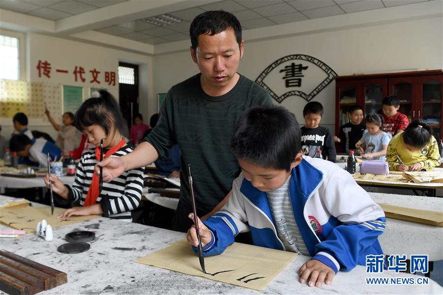 陕西省延安市杨家岭福州希望小学书法社团的学生在老师指导下练习书法(4月24日摄)。新华社记者 刘潇 摄