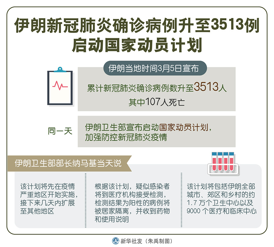 新华社德黑兰3月5日电(记者陈霖)伊朗5日宣布累计新冠肺炎确诊病例数升至3513人。同一天,伊朗卫生部宣布启动国家动员计划,加强防控新冠肺炎疫情。