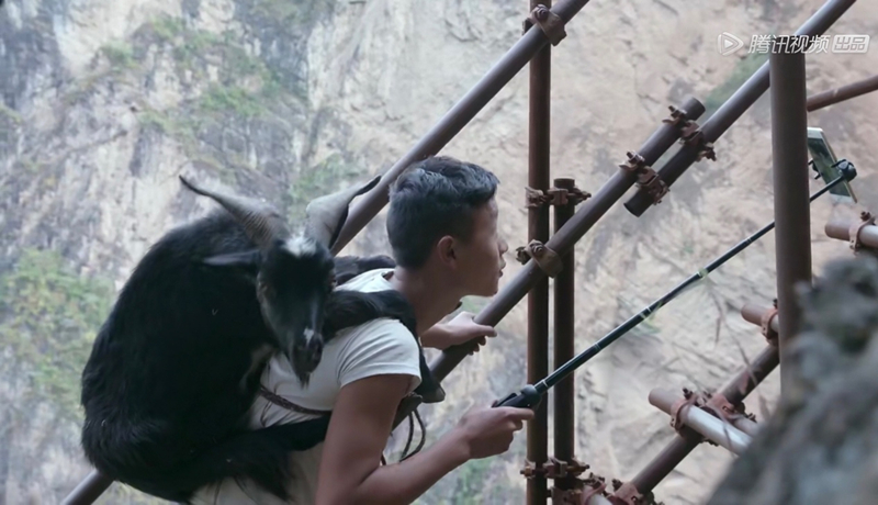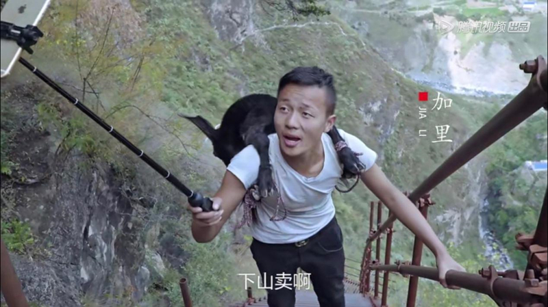 加里背着山羊直播。图片来自腾讯视频纪录片