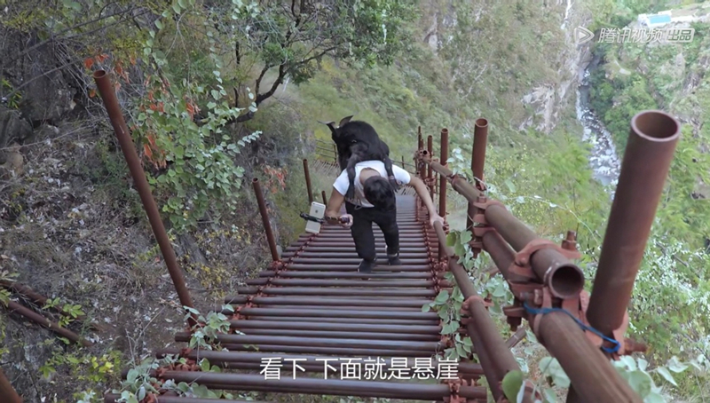 加里曾在“悬崖村”天梯上用4G网络直播卖货。图片来自腾讯视频纪录片