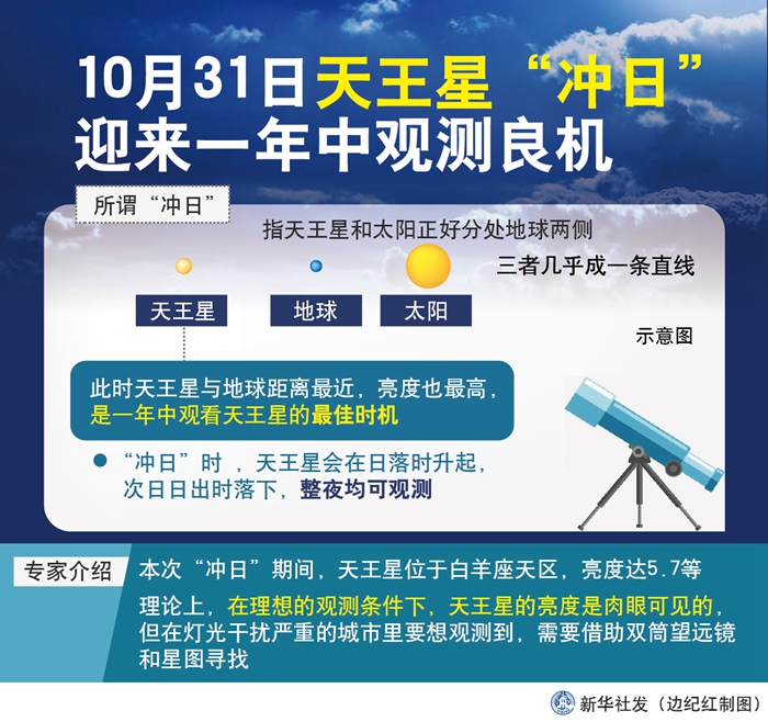 新华社天津10月30日电(记者周润健)10月31日,天王星将上演“冲日”表演,在天气晴好的条件下,感兴趣的公众在双筒望远镜和星图帮助下,可尝试观赏这颗闪亮的淡蓝色星球。