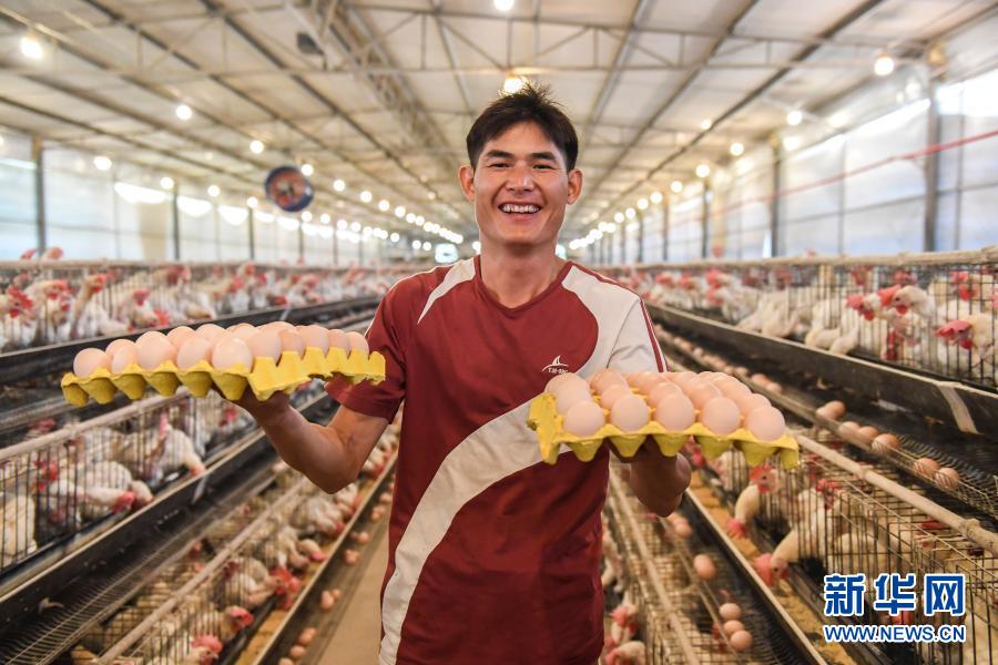 广西武宣县金鸡乡仁元村的返乡创业者覃永灵在养殖场内展示收获的鸡蛋(6月18日摄)。