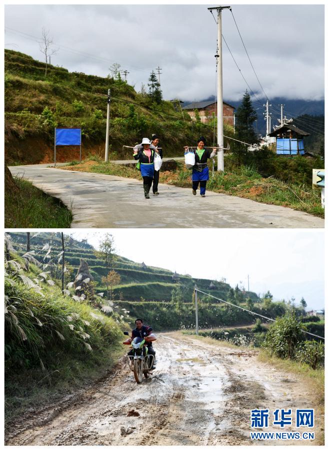拼版照片的上图为下地劳作的村民走在贵州省从江县加勉乡白棒村新修的通村公路上(新华社记者杨文斌3月31日摄);下图为村民骑行在贵州省从江县加勉乡白棒村泥泞不堪的道路上(2016年12月3日摄,贵州桥梁集团供图)。