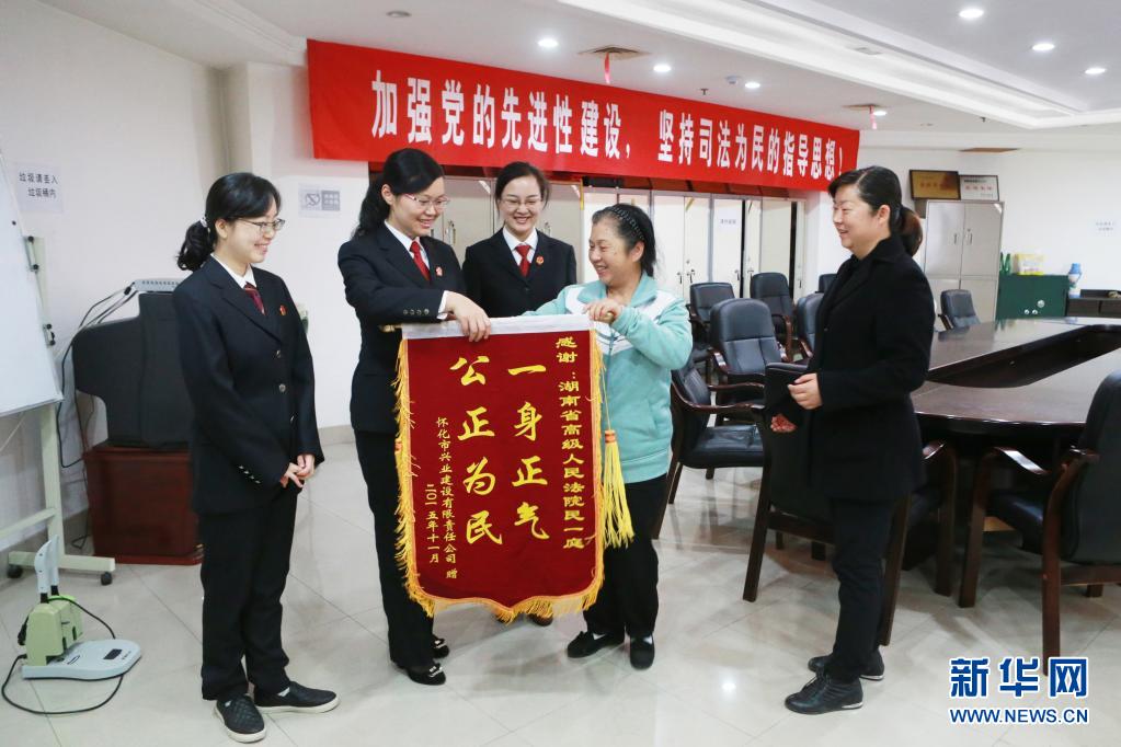 周春梅(左二)接过当事人赠送的锦旗(资料照片)。新华社发