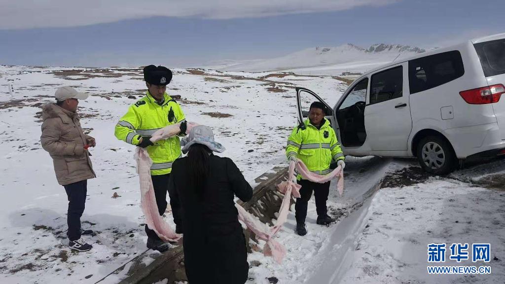 达瓦云旦(左二)在西藏安多县扎仁镇境内路段疏导交通,救助车辆(2020年3月摄)。新华社发