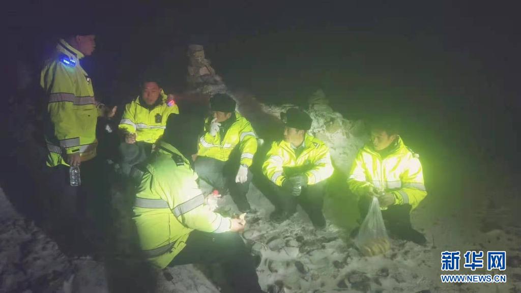 凌晨5点,达瓦云旦所在的西藏安多县交警大队队员在申格里贡山堵车路段疏通交通后席地休息(2019年12月摄)。新华社发