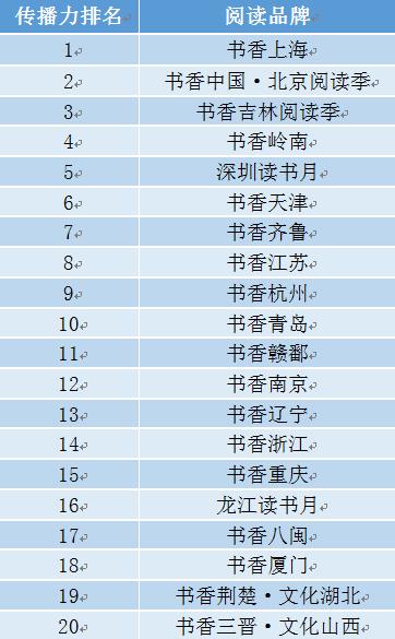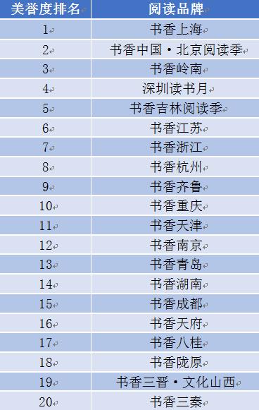 从区域看,入选榜单的品牌多数来自东部地区,包括上海、北京、深圳、广东、江苏、天津、南京、山东、浙江、福建、杭州、青岛、海南13个地区,中部地区有湖南、湖北2个地区,东北地区有吉林、黑龙江2个地区,西部地区有重庆、成都、甘肃3个地区。值得注意的是,深圳市与广东省、杭州市与浙江省、青岛市与山东省、南京市与江苏省4个市与该市所属省的全民阅读活动品牌同时上榜。该榜单体现出全民阅读与区域文化、教育、经济等综合发展水平的正向相关性,上海、北京、深圳占据了榜单的前三名。