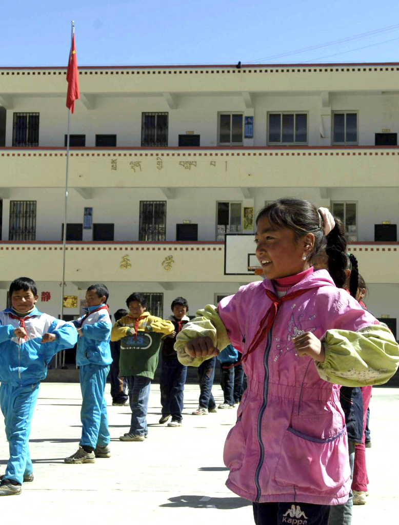 2008年4月16日,四川省阿坝藏族羌族自治州壤塘县南木达易地育人学校的学生在上体育课。 新华社记者海明威 摄