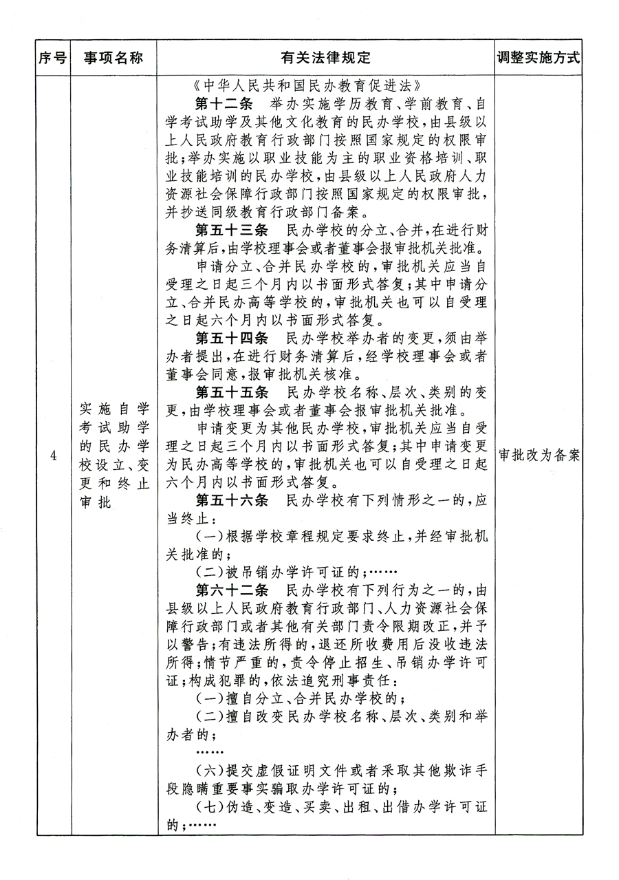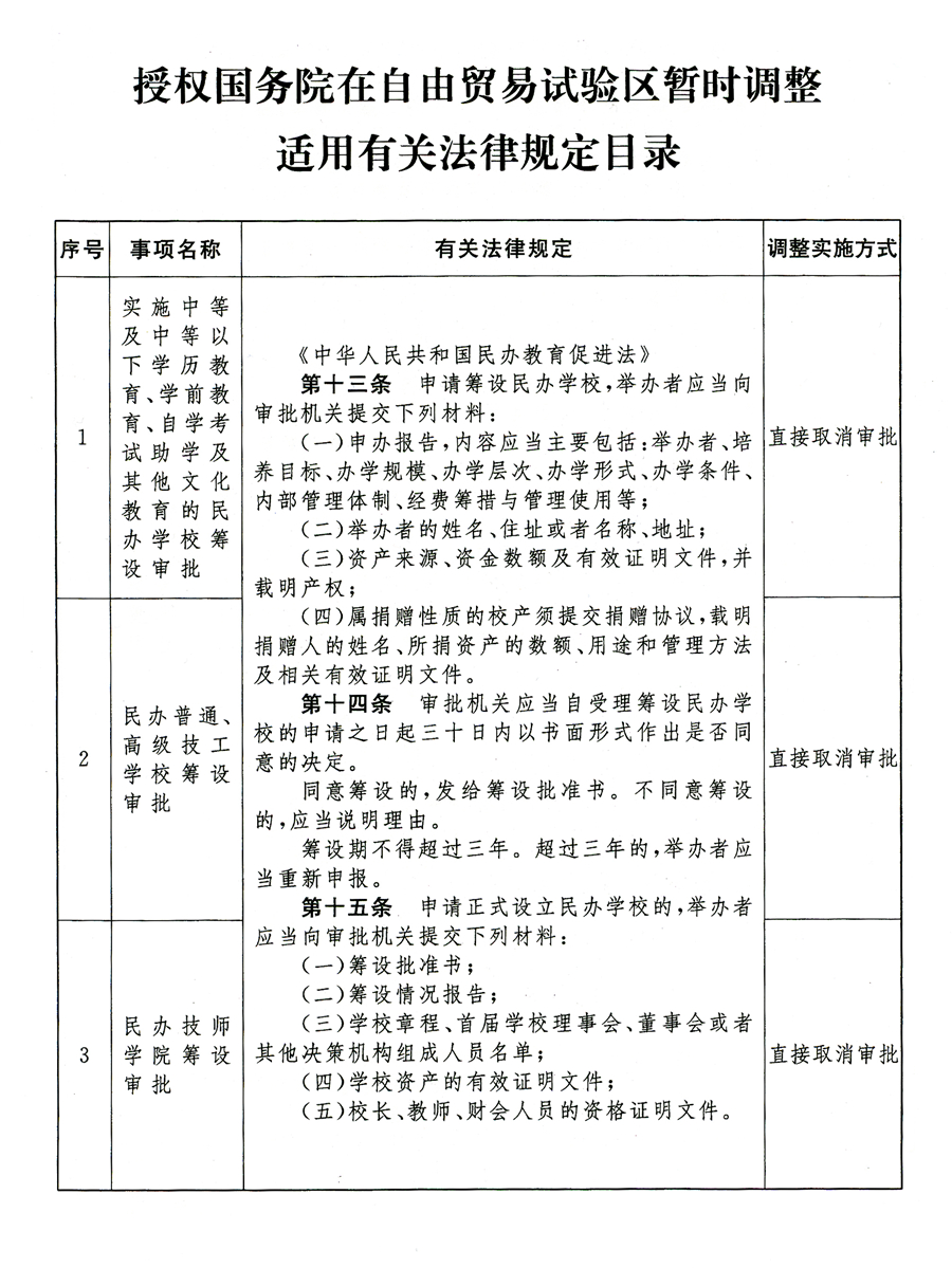 为深化“证照分离”改革,进一步推进“放管服”改革,优化营商环境,激发市场活力,加快政府职能转变,第十三届全国人民代表大会常务委员会第二十八次会议决定:授权国务院在自由贸易试验区内,暂时调整适用《中华人民共和国民办教育促进法》、《中华人民共和国会计法》、《中华人民共和国注册会计师法》、《中华人民共和国拍卖法》、《中华人民共和国银行业监督管理法》、《中华人民共和国商业银行法》、《中华人民共和国保险法》的有关规定(目录附后),自由贸易试验区所在县、不设区的市、市辖区的其他区域参照执行。上述调整的期限为三年,自本决定施行之日起算。