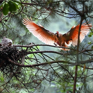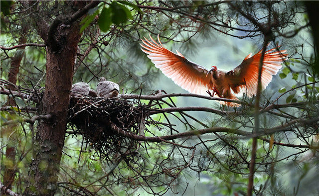 在陕西省洋县溢水镇老庄村一处朱鹮巢点,成鸟觅食归来(5月21日摄)。新华社记者 陶明 摄
