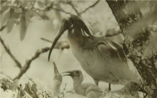 这是1981年在陕西省汉中市洋县姚家沟发现的朱鹮,成鸟在哺育雏鸟(5月12日翻拍照片)。新华社记者 刘潇 摄