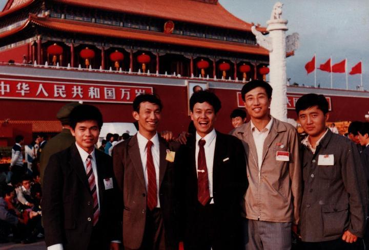 1984年国庆时,邓勇(左三)与同学、同事在天安门合影。