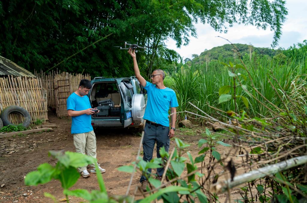 2020年8月8日,亚洲象监测员普宗信(右一)配合同事放飞无人机。 新华社记者 陈欣波 摄