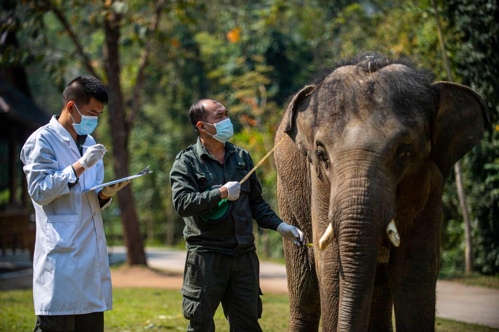 2021年3月6日,“象爸爸”在给大象测量胸围。 新华社记者 江文耀 摄