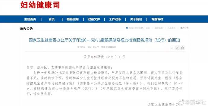 据国家卫健委官网23日消息,国家卫健委印发《0~6岁儿童眼保健及视力检查服务规范(试行)》,其中规定,根据不同年龄段正常儿童眼及视觉发育特点,结合0至6岁儿童健康管理服务时间和频次,为0至6岁儿童提供13次眼保健和视力检查服务,主要由具备相应服务能力的乡镇卫生院、社区卫生服务中心等基层医疗卫生机构或县级妇幼保健机构及其他具备条件的县级医疗机构提供,内容包括健康教育、眼病筛查及视力评估、健康指导、转诊服务和登记儿童眼健康档案信息等。