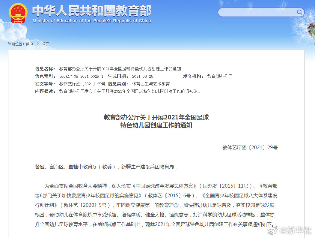 记者6日从教育部官网获悉,教育部办公厅日前发布《关于开展2021年全国足球特色幼儿园创建工作的通知》。要以普及性的幼儿足球游戏培养广大幼儿浓郁的足球兴趣,营造良好的足球文化氛围。要遵循幼儿身心发展特点和教育规律,把握幼儿足球发展规律和特点,转变发展思路,创新发展方式,让幼儿享受足球乐趣,培养足球兴趣。(记者 王鹏)