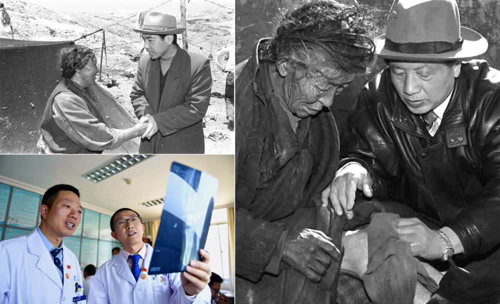 左上图为来自陕西的援藏干部、阿里日土县副县长贾冗勇深入牧区,帮助藏族牧民解决生产、生活的实际困难(新华社记者土登摄,1997年11月11日发);左下图为2017年8月3日,北京积水潭医院援藏医生龚晓峰(右)和北京天坛医院援藏医生李家谋在拉萨市人民医院骨科病房内查看患者的X光片,进行工作交接(新华社记者晋美多吉摄);右图为孔繁森(右)在阿里日土县过巴乡为孤寡老人益西卓玛治病(新华社记者土登摄,1994年12月26日发)。