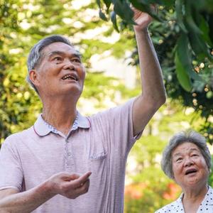 麦贤得与老伴李玉枝在小区里散步(5月22日摄)。新华社发(栾铖 摄)