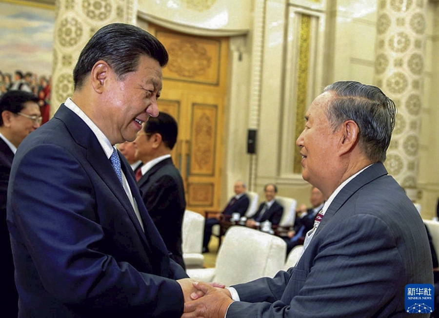 2014年9月5日,中共中央、全国人大常委会在北京人民大会堂隆重举行庆祝全国人民代表大会成立60周年大会。这是会前,中共中央总书记、国家主席、中央军委主席习近平同姜春云同志亲切交谈。新华社发