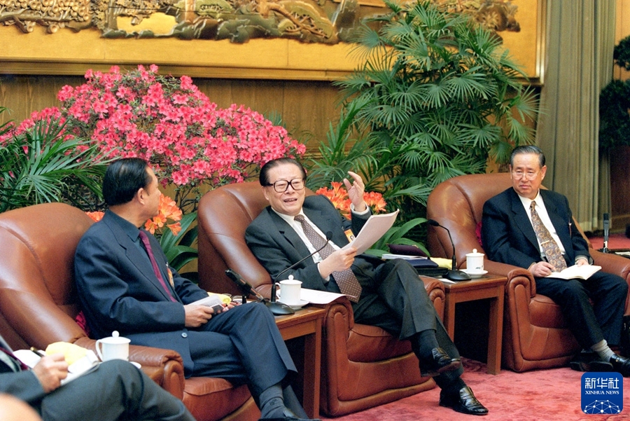 2000年3月13日,江泽民同志和姜春云同志在北京人民大会堂参加九届全国人大三次会议吉林代表团讨论。新华社记者 李学仁 摄
