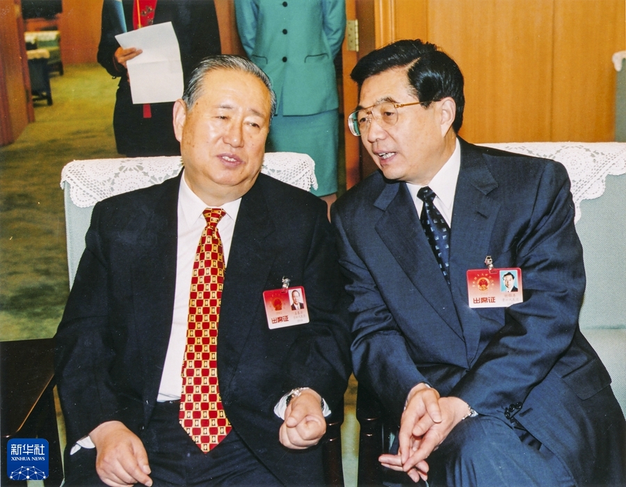 2002年3月,九届全国人大五次会议期间,胡锦涛同志与姜春云同志交谈。新华社发