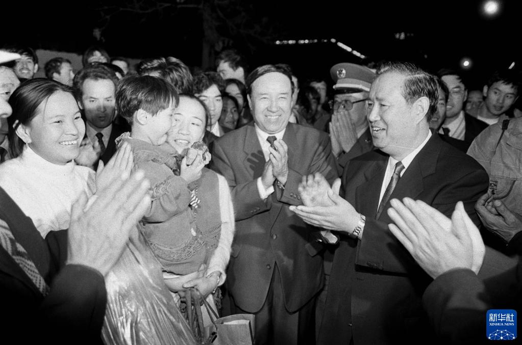1995年10月2日,姜春云等同志同参加新疆维吾尔自治区成立40周年庆祝活动的乌鲁木齐市民亲切交谈。新华社记者 刘卫兵 摄