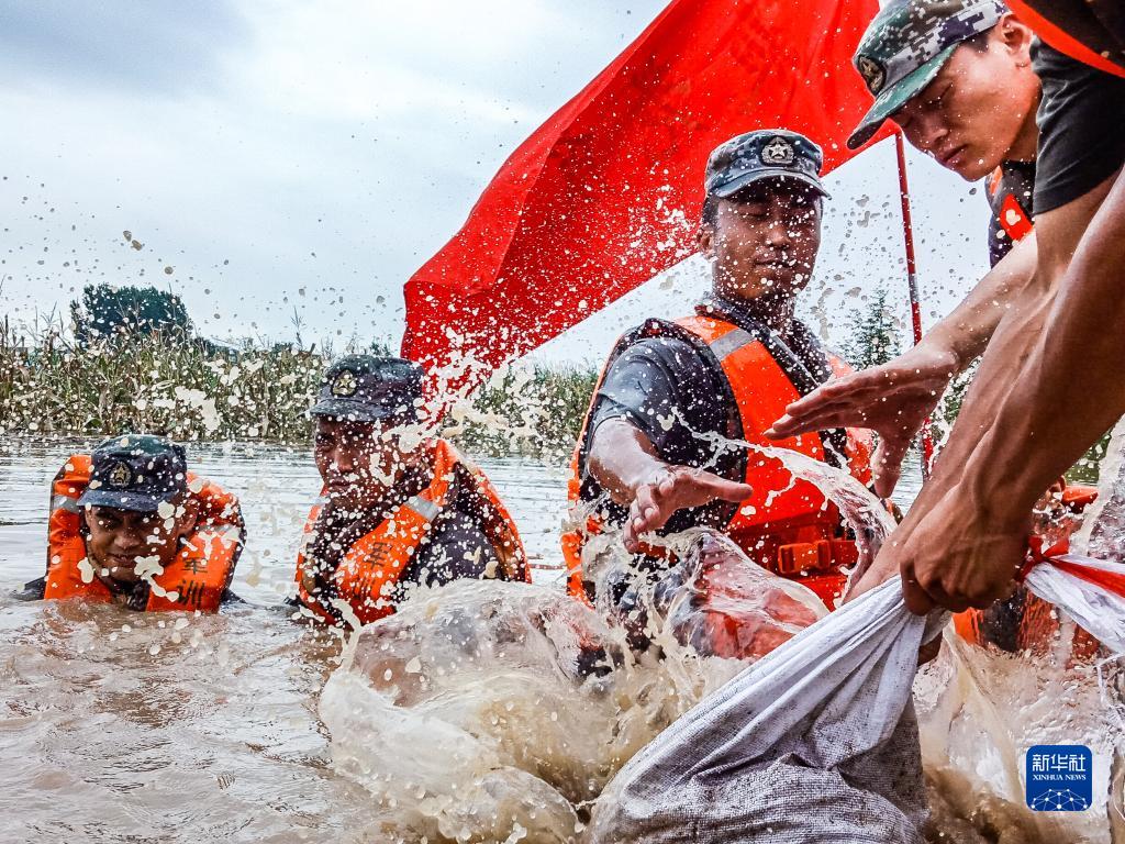 第71集团军某旅官兵在江西九江彭泽县芙蓉墩镇沿江大道东埂封堵管涌(2020年7月13日摄)。新华社发(方知 摄)