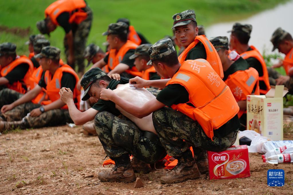 在江西省鄱阳县鄱阳镇江家岭村,武警官兵在休息时互相涂抹药粉,连日奋战让许多战士长痱子或晒伤(2020年7月11日摄)。来自武警江西省总队机动支队的官兵与当地干部、村民一起连续奋战,用沙袋和土石在昌江堤上垒起了一道一米多高、三公里长的临时防水墙。新华社记者 周密 摄